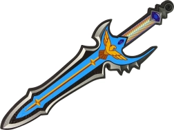 Detalicznie zdobiony niebieski miecz z dekoracyjną rękojeścią jest lekki w dłoni i doskonale uzupełnia tarczę, tworząc kompletny rycerski ekwipunek.