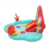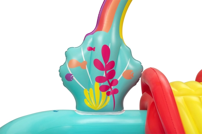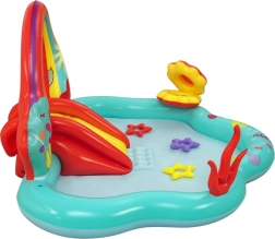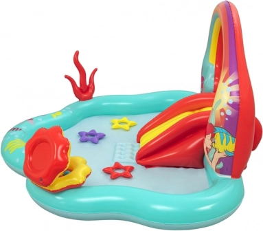 Nadmuchiwany wodny plac zabaw Bestway Mała Syrenka przynosi do Twojego ogrodu magiczny świat z bajki. Wykonane z trwałego PVC, to plac zabaw o wymiarach 221 cm x 193 cm x 117 cm oferuje mnóstwo zabawy i wyobraźni dla dzieci w wieku od 2 lat. Dzieci będą się cieszyć zjeżdżalnią zakończoną miękką poduszką i fontanną wodną, którą można aktywować poprzez podłączenie węża ogrodowego.