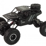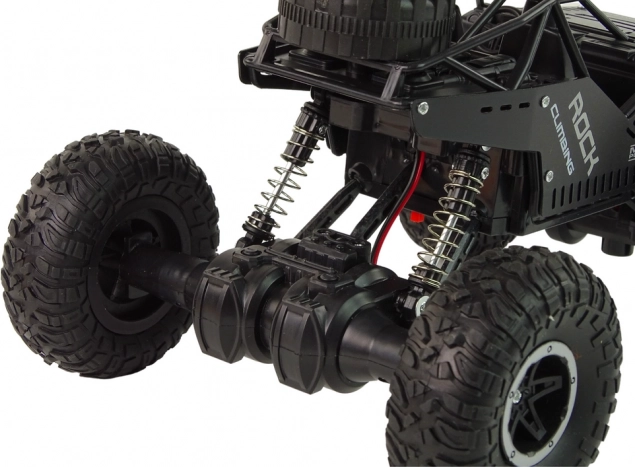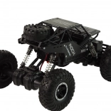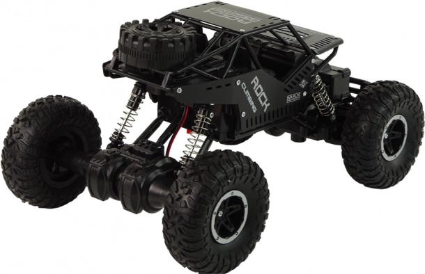 Pojazd ma elegancki czarny kolor, który nadaje mu agresywny i stylowy wygląd, przypominający auta terenowe używane w trudnych warunkach.