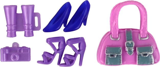 W zestawie znajduje się także kilka elementów garderoby, w tym dwie dodatkowe sukienki oraz spodnie z bluzką, by lalka mogła zmieniać styl w zależności od nastroju. Dwie pary butów, torebka, mały aparat fotograficzny i lornetka uzupełniają praktyczne akcesoria na różne okazje i pobudzają dziecięcą wyobraźnię do planowania wycieczek oraz sesji fotograficznych.