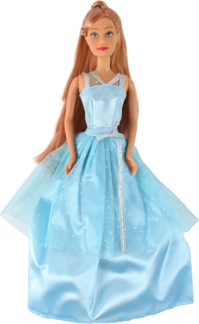 Lalka ma na sobie długą, błyszczącą niebieską suknię z tiulową narzutką i subtelnymi srebrnymi akcentami. Idealna do królewskich przygód.
