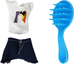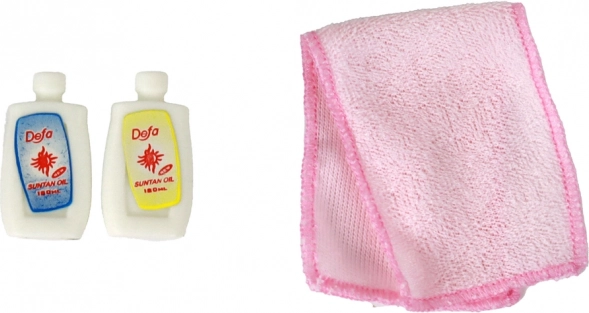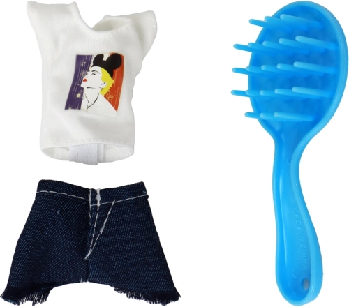 Bluzka z nadrukiem, dżinsowa spódniczka, różowy ręcznik i mini buteleczki do zabawy w kosmetyki – wszystko w jednym miejscu dla różnorodnych historii.