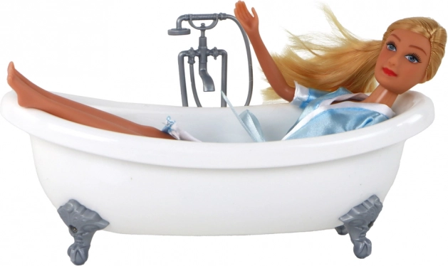 Stylowa biała wanna z metalicznie stylizowanymi nóżkami zamieni każdą zabawę w prawdziwy relaks w spa. Idealna do scenek relaksacyjnych i opieki nad lalką.