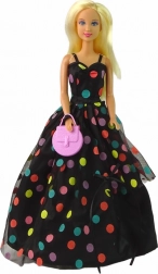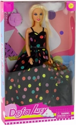 Urocza lalka DEFA LUCY zachwyca długimi blond włosami, czarną sukienką w kolorowe groszki i stylowymi dodatkami. W zestawie znajdziesz różową torebkę, czerwone buciki i bransoletkę. Idealna dla dzieci od 3 lat, świetna do zabawy i jako dekoracja do pokoju dziecięcego.