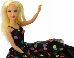 Lalka DEFA LUCY wnosi elegancki styl i subtelne detale, które zachwycą każdego małego miłośnika mody. Długie, lekko falowane blond włosy, długa czarna sukienka w kolorowe groszki i dopasowane dodatki tworzą harmonijny i figlarny wygląd. Delikatny makijaż oczu w niebiesko-różowych tonach i różowe usta podkreślają jej urok.