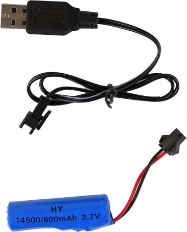 W komplecie znajduje się bateria 14500/800 mAh 3,7 V oraz kabel do ładowania USB, więc nie musisz dokupować zasilania do traktora.