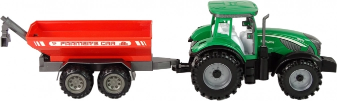 zielony traktor z czerwonym przyczepą z napędem ciernym