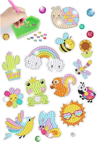 Naklejki przedstawiają zwierzątka jak wiewiórkę, żabę, owady, kwiaty i kolorową tęczę. Idealne dla dzieci od 5 lat, doskonały prezent!
