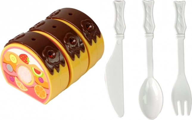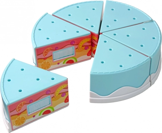 Tort składa się z sześciu trójkątnych kawałków, które dzięki rzepowi łatwo rozkroisz i ponownie połączysz. Realistyczna zabawa bez ostrych krawędzi i bałaganu.