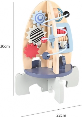 To wielofunkcyjne centrum aktywności w kształcie rakiety zamienia zabawę w przyjemną naukę. Dzieci będą przesuwać kolorowe koraliki w labiryncie, obracać koła zębate i próbować pierwszego liczenia – wszystko to wspiera koordynację ręka–oko, cierpliwość i koncentrację. Kosmiczny motyw dodatkowo pobudza wyobraźnię i ciekawość.