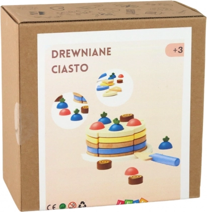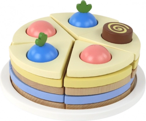 Ten wysokiej jakości drewniany tort podzielono na segmenty połączone rzepami. Dzieci mogą więc łatwo „kroić”, układać i serwować porcje, ćwiczyć chwyt oraz rozwijać wyobraźnię. Kolorowe ozdoby i elementy zachęcają do odkrywania, nauki kolorów i kształtów.