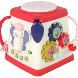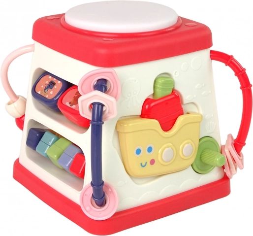 - Efekty świetlne, melodie, odgłosy zwierząt, angielskie słówka, zębate kółka, koraliki, łódeczka na obrotowej dźwigni, kształty do ćwiczenia motoryki