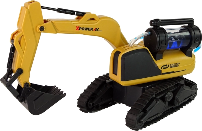 Gumowe gąsienice gwarantują stabilny i płynny ruch na różnych powierzchniach, a efekty dźwiękowe i wizualny element z niebieskim płynem w górnej części maszyny dodają zabawie autentycznej atmosfery budowy. Ergonomiczny pilot dobrze leży nawet w małych dłoniach.