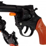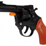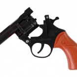 Rewolwer jest zasilany kapiszonami perkusyjnymi, które umożliwiają strzelanie bez potrzeby użycia prawdziwej amunicji. Dzięki temu pistolet kapiszonowy jest całkowicie bezpieczny zarówno dla Twojego dziecka, jak i dla środowiska. Broń jest łatwa w użyciu, więc Twoje dziecko szybko nauczy się oddawać pierwsze strzały. Plastikowy magazynek otwierany jest pomarańczową śrubą pod lufą, a w środku jest miejsce na 8 nabojów.