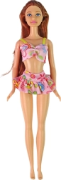 Lalka ma długie brązowe włosy i jest ubrana w różowe wzory, idealna na letnie przygody.