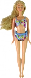 Lalka z długimi blond włosami i letnim kwiatowym strojem kąpielowym jest gotowa na gorące letnie dni.