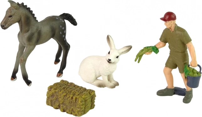 - Zawartość zestawu: szary koń, farmer z marchewką, zając, bela siana