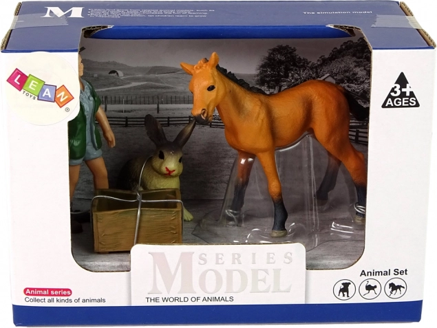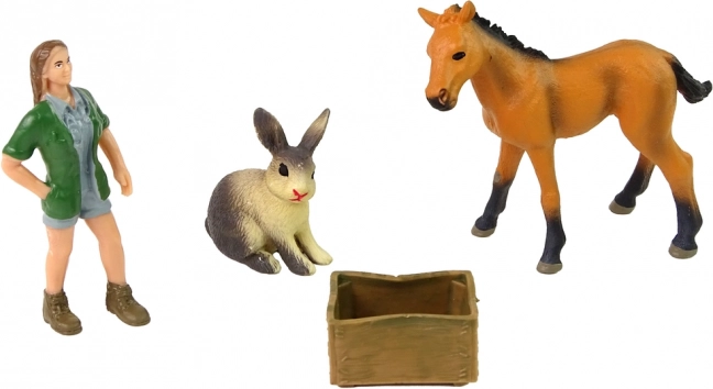 Zestaw figurek z jasnym koniem, zającem i weterynarzem do kreatywnej zabawy. Realistyczne wykonanie, twarda guma oraz nietoksyczne materiały zapewniają bezpieczną rozrywkę dla dzieci od 3 lat.