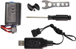W zestawie znajdziesz: łódź, kontroler 2,4 GHz, pokrywę antykolizyjną, akumulator, kabel do ładowania USB, zapasową śrubę, klucz, śrubokręt, podstawkę i instrukcję.