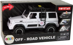 Realistyczne białe auto terenowe w skali 1:14 zapewnia mnóstwo zabawy dzięki napędowi frykcyjnemu, efektom świetlnym i dźwiękom. Otwierane drzwi, światła dachowe oraz praktyczny bagażnik z drabinką wspierają kreatywną zabawę w domu i na zewnątrz. Duże koła radzą sobie z różnymi nawierzchniami, a interaktywny przycisk na dachu umożliwia przełączanie różnych efektów dźwiękowych.