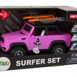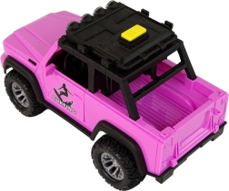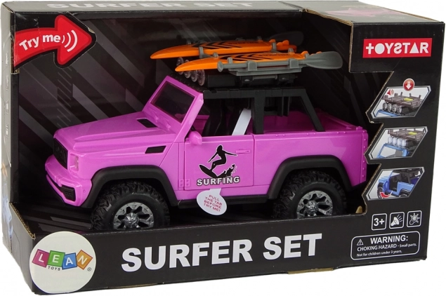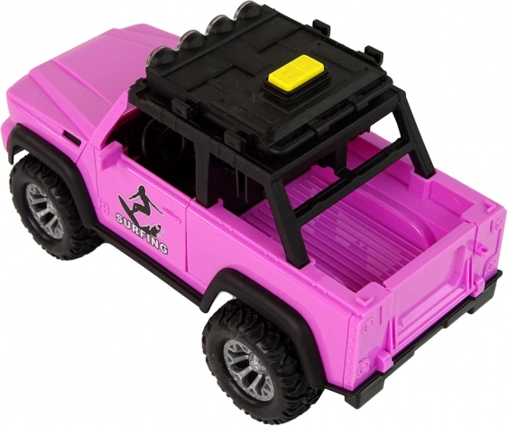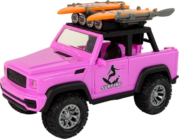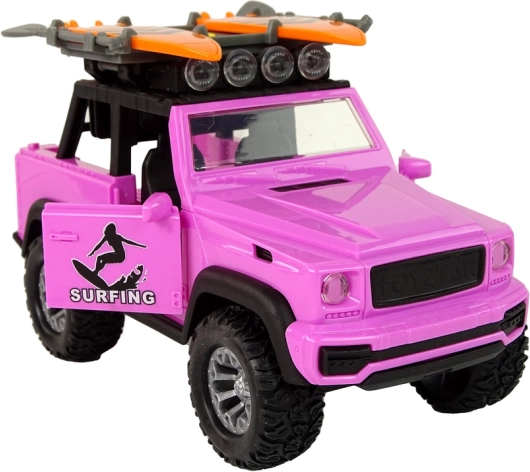 Stylowy różowy samochód terenowy w skali 1:14 ucieszy małych poszukiwaczy przygód motywem surfingu. Oferuje napęd bezwładnościowy, efekty świetlne i dźwiękowe, otwierane drzwi oraz na dachu uchwyty na deski surfingowe z wiosłami. Wytrzymałe wykonanie z dużymi kołami jest idealne do pomysłowej zabawy w domu i na zewnątrz.