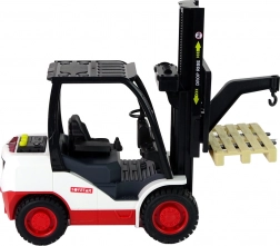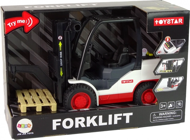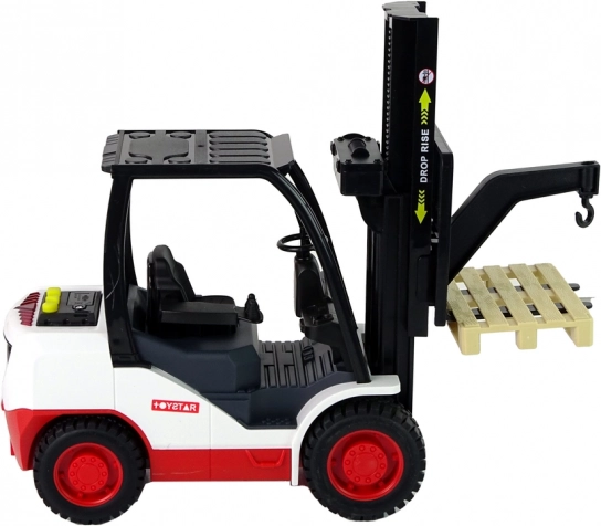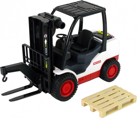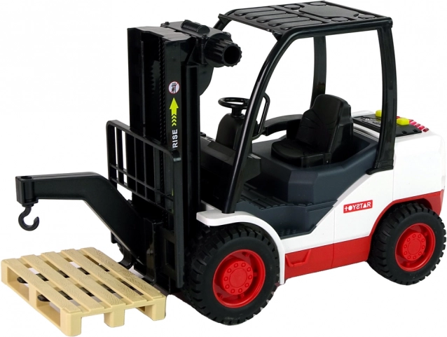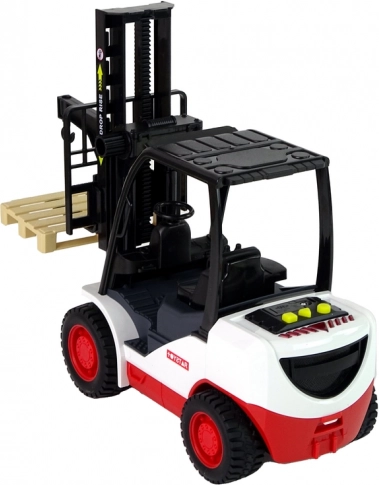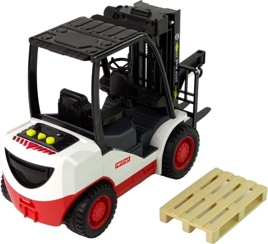 Ten dopracowany w detalach wózek widłowy zachwyci wszystkich małych miłośników maszyn roboczych. Dzięki pokrętłu widły można łatwo podnosić i opuszczać, a trzy realistyczne dźwięki i czerwone światło po naciśnięciu żółtych przycisków potęgują wrażenia z zabawy. W zestawie zdejmowana paleta do załadunku i rozładunku.