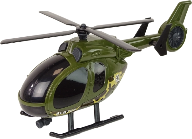 Realistycznie ukształtowany helikopter z kamuflażem i wirnikiem, który można ręcznie rozkręcić – idealny do dynamicznych scen lotniczych.