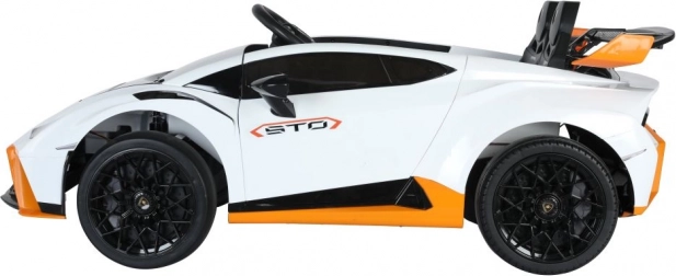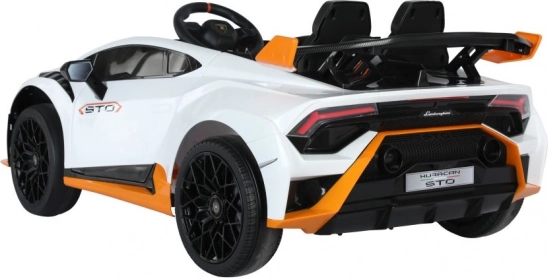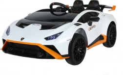 Stylowy dziecięcy elektryczny samochodzik inspirowany supersamochodem LAMBORGHINI STO zapewnia zabawę w drifcie, sportowy design i realistyczne detale. Białe wykończenie z pomarańczowymi akcentami, światła, wierne koła i wygodne siedzisko gwarantują bezpieczną i ekscytującą jazdę dla małych kierowców.