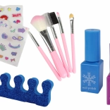 Dla łatwej aplikacji dodano praktyczny zestaw narzędzi: 3 różowe pędzle, aplikator i szczoteczkę do brwi. Zawiera również niezbędne elementy do zdobienia paznokci: niebieski brokatowy separator palców, pilnik i 3D naklejki na unikalny design.