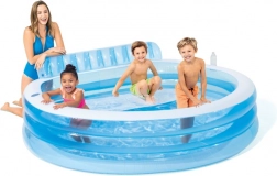 Rodzinny dmuchany basen INTEX oferuje przestronną kąpiel dla dzieci i dorosłych, zintegrowaną ławkę z oparciem dla wygodnego relaksu oraz uchwyty na napoje dla maksymalnego komfortu. Wytrzymały materiał PVC, zawór szybkiego spuszczania i dołączona samoprzylepna łatka czynią go idealnym wyborem do ogrodu w upalne dni.