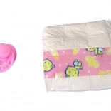 Opakowanie zawiera smoczek i pieluszkę, dzięki którym dzieci mogą przewijać i uspokajać niemowlę jak prawdziwi mali opiekunowie.