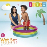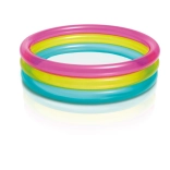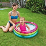 Nadmuchiwany dziecięcy basen INTEX Rainbow jest kolorowy i praktyczny na letnie dni. Dzięki trzem przezroczystym pierścieniom jest stabilny i wygodny, a kompaktowe wymiary 86 × 25 cm mieszczą się na większości ogrodów, tarasów i balkonów. Pojemność 68 litrów przy zalecanym poziomie wody 17 cm zapewnia bezpieczną, płytką powierzchnię wodną dla maluchów.