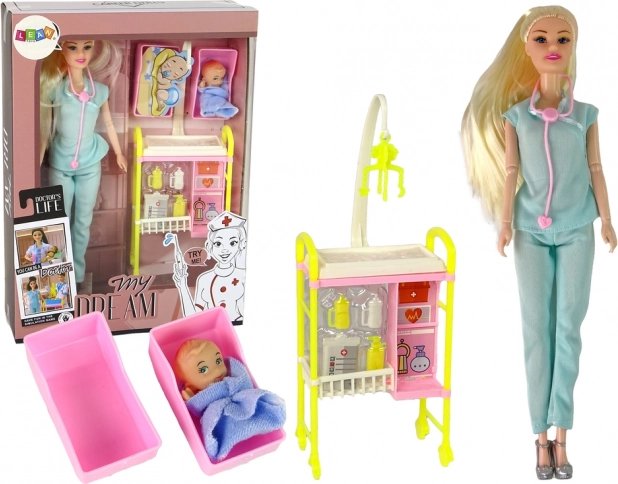 Przygotuj się na fascynujący świat medycyny z tą wyjątkową lalką. Ubrana w typowy lekarski strój i z długimi blond włosami, wnosi autentyczną atmosferę do każdej zabawy. Różowy stetoskop dodaje wiarygodności, a dołączone akcesoria, takie jak niemowlę czy wózek medyczny, wspierają kreatywną zabawę.