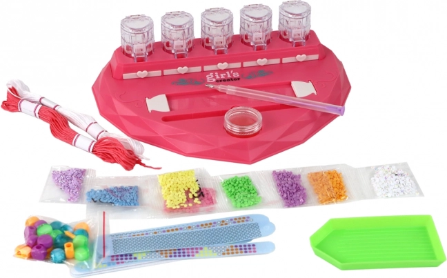 W komplecie znajdują się „diamentowe” kamyczki, kolorowe koraliki oraz 2 motki muliny (różowa i biała) do łatwego wiązania i dekoracyjnych elementów. 5 zamykanych przegródek utrzyma drobiazgi na miejscu, dzięki czemu wszystko jest zawsze pod ręką, a tworzenie – przejrzyste i przyjemne.