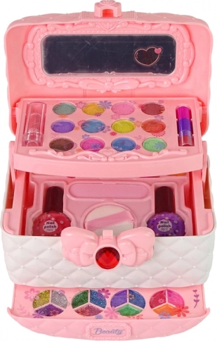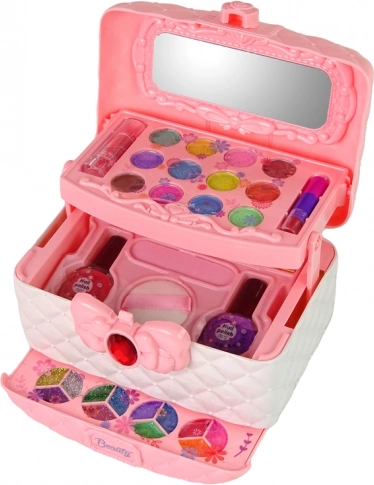 Ten elegancki kuferek z kokardką skrywa wszystko, co potrzebne do bezpiecznego dziecięcego makijażu i kreatywnej zabawy w salon piękności. Dzięki trzem przejrzystym szufladkom dzieci mają wszystkie akcesoria pod ręką, a lusterko w pokrywie pomoże w dopracowaniu finałowego wyglądu. Kompaktowe wymiary 16 × 18 × 10 cm zapewniają łatwe przenoszenie na wizyty i wakacje.