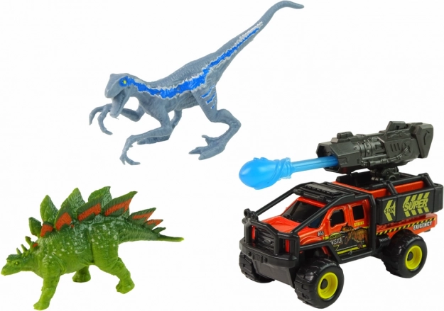 Ten zestaw przeniesie dzieci do fascynującego świata dinozaurów. Znajdą w nim welociraptora w niebiesko–brązowym ubarwieniu z prążkami dla autentycznego wyglądu oraz stegozura w zielonym kolorze z wyrazistą pomarańczową „grzywą” na grzbiecie. W zestawie jest także nowoczesny pojazd terenowy wyposażony w wyrzutnię rakiet z ruchomym pociskiem dla jeszcze większej dawki akcji.