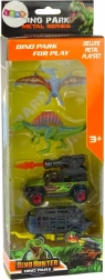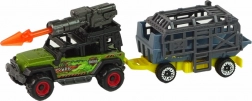 Zestaw dinozaurów z autem terenowym, wyrzutnią rakiet i przyczepą z klatką