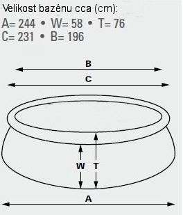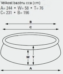 Samonośny basen. Wymiary 183 cm (górny obwód 145 cm) x 51 cm. Poziom wody 41 cm. Pojemność 900 l.