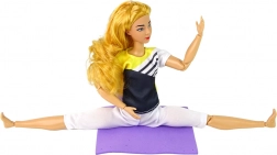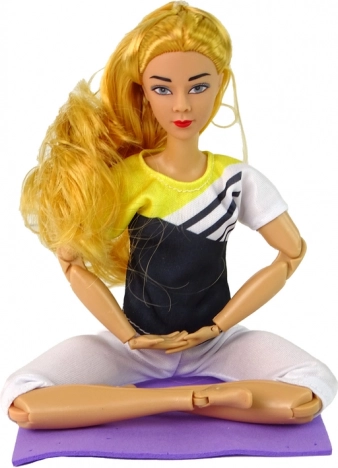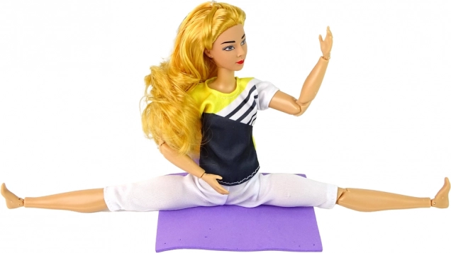 Włosy można czesać i stylizować, a sportowy strój podkreśla tematyczną zabawę. Mata 12 × 10 cm pozwala stworzyć własne mini studio jogi.