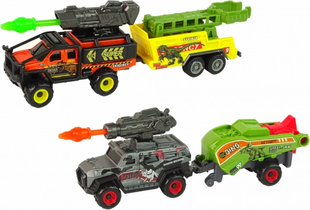 Ten zestaw zawiera dwa pojazdy zabawkowe z przyczepami do transportu dinozaurów. Każdy pojazd jest wyposażony w obrotową wyrzutnię, co dodaje akcji do zabawy. Szczegółowe wykonanie tych pojazdów czyni zabawę jeszcze bardziej interesującą.