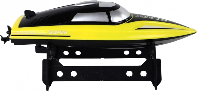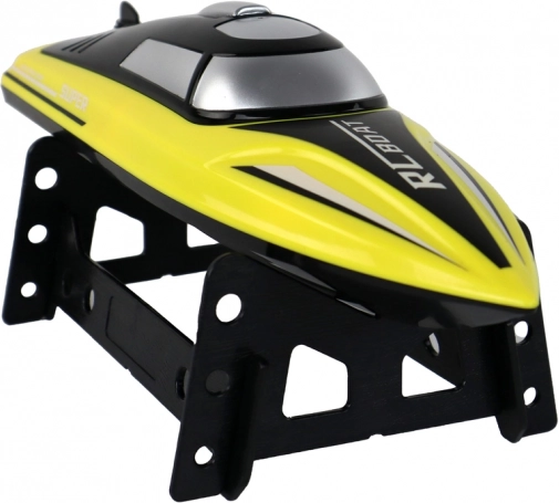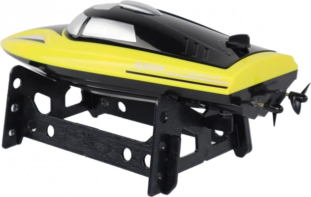 W zestawie znajdują się także akcesoria, takie jak kabel do akumulatora, śrubokręt, podstawka pod motorówkę, aby stabilnie stała na lądzie, oraz dwie śrubki.