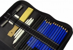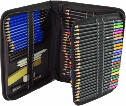 - 72 kredki; 12 grafitowych ołówków o różnej twardości; węgiel w 3 twardościach; 3 narzędzia do rozcierania + czyścik; gumka; temperówka; przedłużacz do ołówków