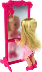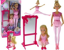 Elegancka baletowa mama w różowym kostiumie z błyszczącymi elementami i tiulową spódniczką uczy swoją małą baletnicę pierwszych piruetów. Obie lalki mają różowe baletki i długie blond włosy upięte na lekcję tańca. Duże różowe lustro z dekoracjami tworzy bajkową scenę do codziennych treningów i wielkich występów.