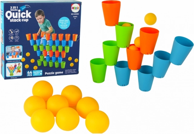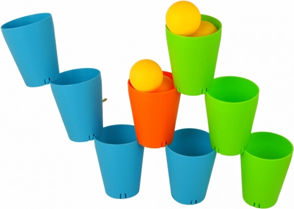 Zestaw zawiera kubeczki w trzech kolorach: pomarańczowym, zielonym i niebieskim z żółtymi piłeczkami do zabawnej aranżacji i układania.