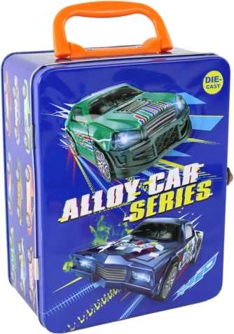 W zestawie stylowa blaszana walizeczka z motywem aut sportowych, metalowym zapięciem i składaną rączką. Wewnątrz znajdziesz przejrzyste przegródki do bezpiecznego przechowywania autek – perfekcyjne dla małych kolekcjonerów w podróży i w pokoju.