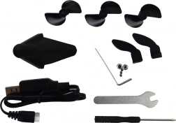 W komplecie znajdują się również akcesoria, takie jak przewód do akumulatora, stojak na łódź motorową zapewniający stabilność na lądzie, dwie wymienne śruby napędowe oraz dwa wymienne stery.
