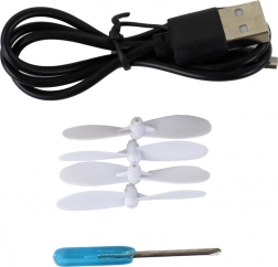 - Samolot, pilot, akumulator, przewód USB do ładowania, 4 zapasowe śmigła, instrukcja