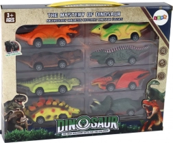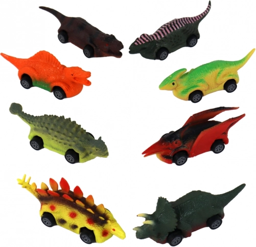 Zestaw zawiera ośmioelementową kolekcję dinozaurów w różnych kolorach i kształtach, w tym triceratopsa i stegozaura, co dodaje zabawie różnorodności.