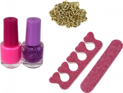 Dwa lakiery do paznokci w żywych kolorach, separator palców i pilniczek tworzą mini salon dla małych elegantek. Łatwe i zabawne zdobienie paznokci w każdej chwili.