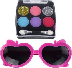 - 2× pomadka (czerwona), paletka cieni do powiek (różowy, fioletowy, niebieski, brokatowy srebrny i złoty), 2× paletka do konturowania, dziecięce różowe okulary w kształcie serca, pędzle do makijażu, separator palców, pilnik do paznokci, 2× lakier do paznokci, plastikowe etui donut z łańcuszkiem